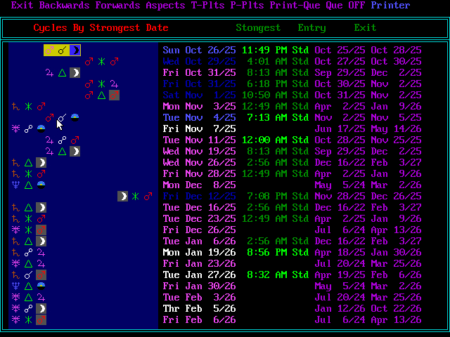 An example would be the one right at the bottom. Uranus Sextile (60%) Progressed Mars. This cycle began July 6/24 and will end completely on Apr 11/26. The last strongest date is Feb 6/26. If you look at the 10th one down. The one with the gray shaded Moon. Thi is Jupiter Trine (120%) progressed Moon. On this screen we can see that the cycle itself began September 29/25 and ends completely on December 2/25. The last exact angle is on November 19th. The Next one down gives us the duration of how long the Saturn Trine (120%) Progressed Moon lasts. Again on the right hand side for the dates December 16/22 till February 3/27. The NEXT exact date, not the last is Nov 26/25 That is basically how that screen works. It can be set to include all the daily and moon cycles, or just one transiting planet or one natal planet. [ A Lone Wolf ] |