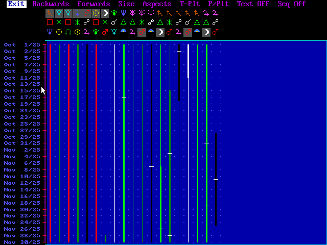 The short White vertical lines crossing the horizontal lines is the day it is at this strongest being in the exact angles degree. Like transiting Mars at 6 Virgo 25.8 and a natal Venus at 25 Pieces 25.8 exactly 180% for that moment in time Looking from left to right. The top row are the cycling or transiting planets. The bottom row are the natal and progressed planets for the two months in question. The top row starting at the left with the gray shading are the quotidian progressions. In this case the first seven. All the rest have a black background and are the planets and there position daily through October and November. The bottom line are the natal and progressed planets. The ones with the gray background are progressed planets from birth. The center line is the astrological symbol for the angles. So, the one on the furthest right which shows only a black thick line that starts and ends. This means it is a one pass of Jupiter opposition (180%) Mars. The green line on the left, next to the one above, had 3 short white lines crossing the thick green line. In this case Jupiter is trine (120%) to the progressed Moon, which is moving 1% a month creating the months of October and November to have 3 dates when the 120% is exact. Could be more before and/or after. If you look at the 7th one from the right hand side. It starts with a thin green line and changes into a thick green line with a white crossing line. I point this one out due to Saturn on a 28 year orbit and the Moon on a 28 day orbit. Saturn stays in each sign for 2.5 years and the progressed Moon stays in sign for 2.5 years. This cycle can last for a few decades. Same with Neptune to progressed mercury lasting a few decades. I have experienced both of these. Hehehe … This photo is listed by the strongest date and time when the angle is exact. This photo Octboer and November's Major and Intermediate cycles only. These major ones are listed into the following year when the cycle ends. End dates are very important as well as the strongest dates.