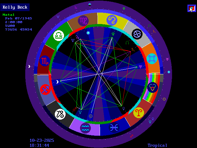 The other ring of the planets are the daily progressions from birth, either for right now or any past or future time. This is quotidian progressions. It is timed so that the rising degree at the exact time of birth comes back to it's starting point, which is the exact degree rising in the Natal Chart, after going around the chart's 360 degrees from birthday to birthday The exact degree and minute rising and setting at the first breath. The other main energy point is the 90% horizontal line. Like a movie, the bar scene. We see the foreground actors which are located within 15% both sides, 4 angles. There is the Immediate Foreground which is the first 7.5% from the angles. The next 15% starts at 15% to 30% from each angle. The remaining 30% is the background. This is not to say that all significant influences, whether foreground or back ground don't have a significant role to play in our individual expression within and without. [ A Lone Wolf ] |